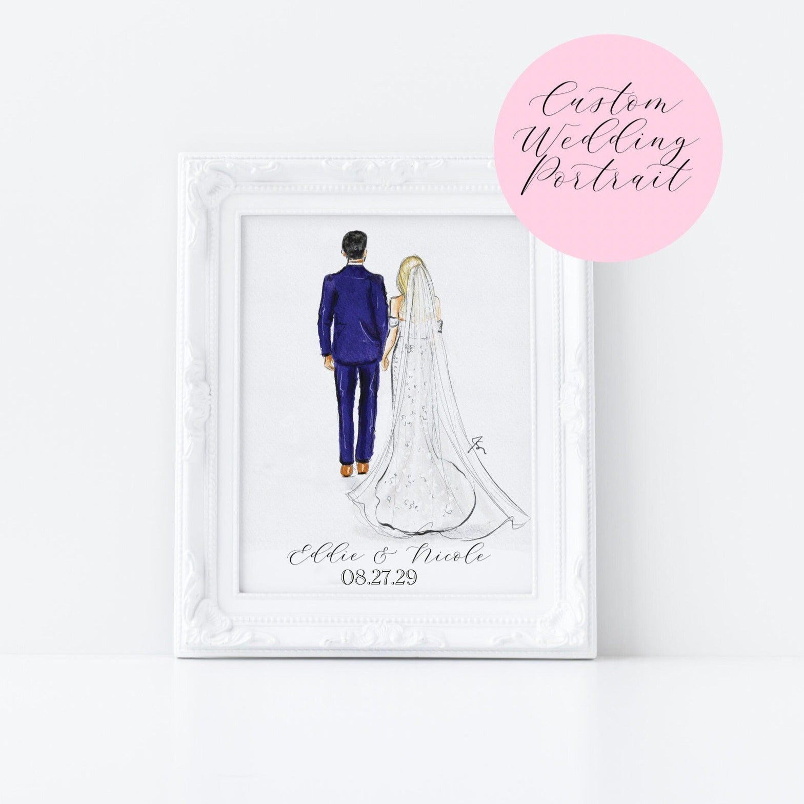 Celebrate a love story with a custom wedding illustration designed to be treasured for years to come. This elegant, hand-illustrated artwork captures the couple from behind in a timeless, minimalist style — a beautiful way to commemorate a wedding day, anniversary, engagement, or meaningful milestone.